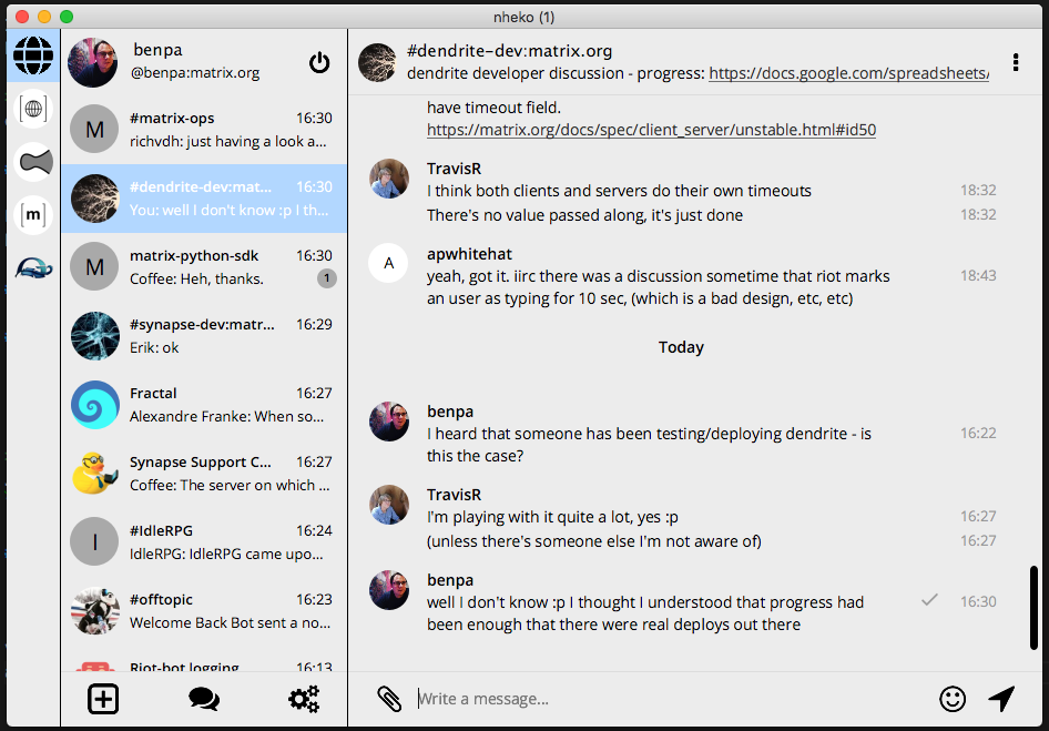 Big E2E progress from mujx, developer of the nheko client on his project mtxclientAs of this week, mxtclient is able to decrypt group events. When writing (that is, sending encrypted messages) is complete, the idea is to migrate this work back to nheko, though mujx points out this library could be used in any client.