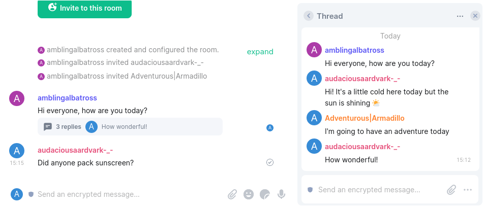 - List of threads in a room is now more accurate and viewing very long threads has improved with the integration with the homeserver APIs. (These APIs are not enabled on matrix.org yet.)