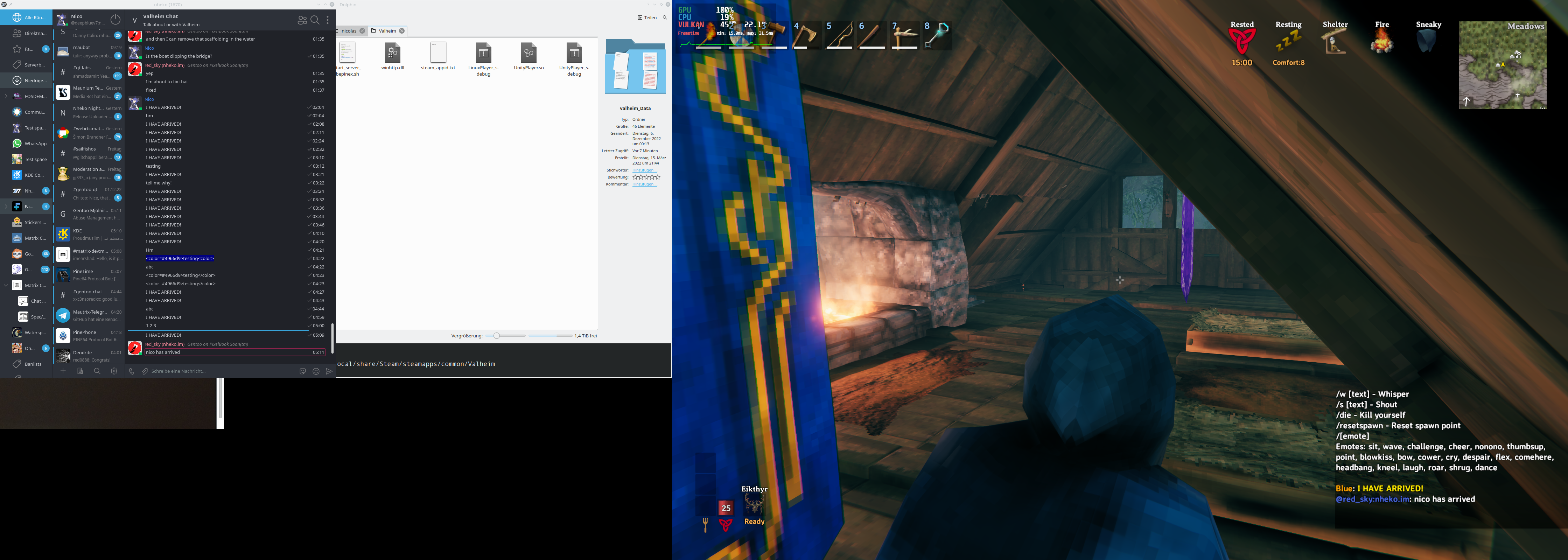 I built a Valheim Mod to bridge Matrix messages from and to Valheim, so that I didn't have to switch windows as often when playing with the other Nheko devs. You can find it here: https://nheko.im/nheko-reborn/valheimmatrix