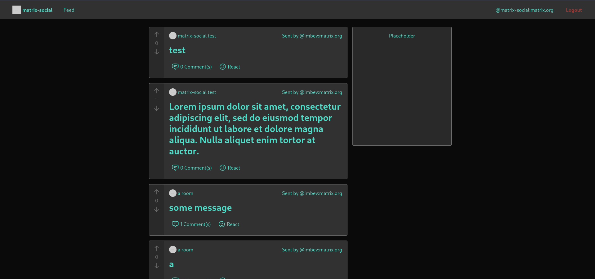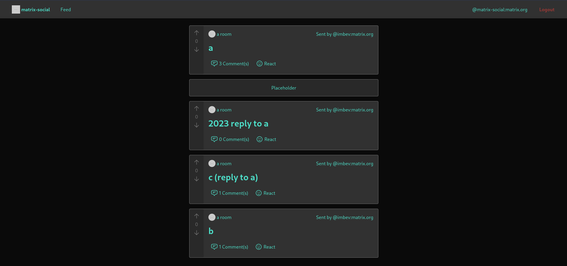 - Posts now display a comment count. There is also a "score", which can be incremented/decremented by thumbsup/thumbsdown reactions. There is currently progress on reacting from matrix-social.