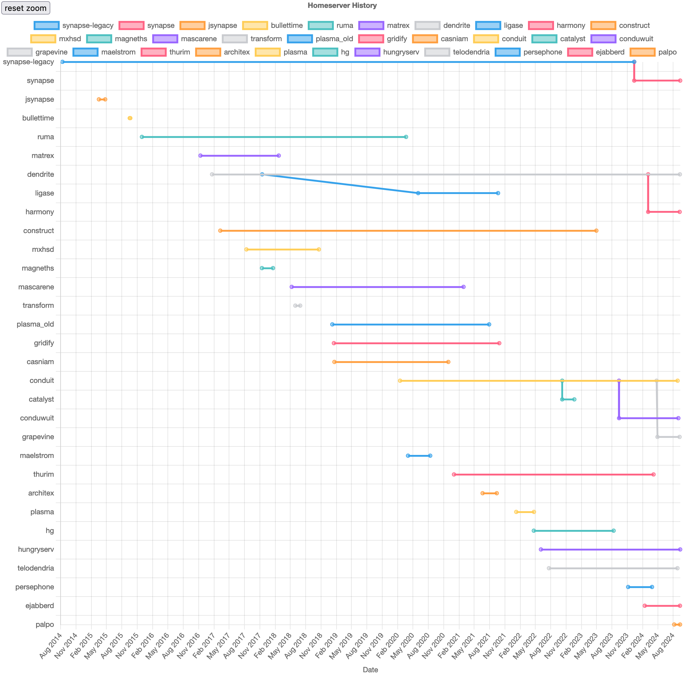 My homeserver-spec-versions dashboard which displays information on spec version supported by different homeservers (and how long it takes homeserver implementations to support each spec version) has had a bunch of updates in the past ~6 months: