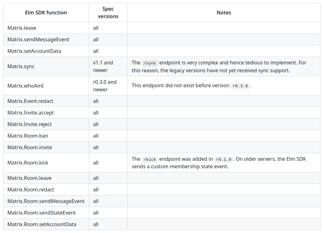 to quickly access the most commonly used state eventsAdditionally, using backwards compatibility, the Elm SDK now supports ALL official spec versions! (Including historical ones.) This means that you can safely update the Elm SDK without needing to wait for your homeserver to update. You can now view the supported versions document for an in-depth table.