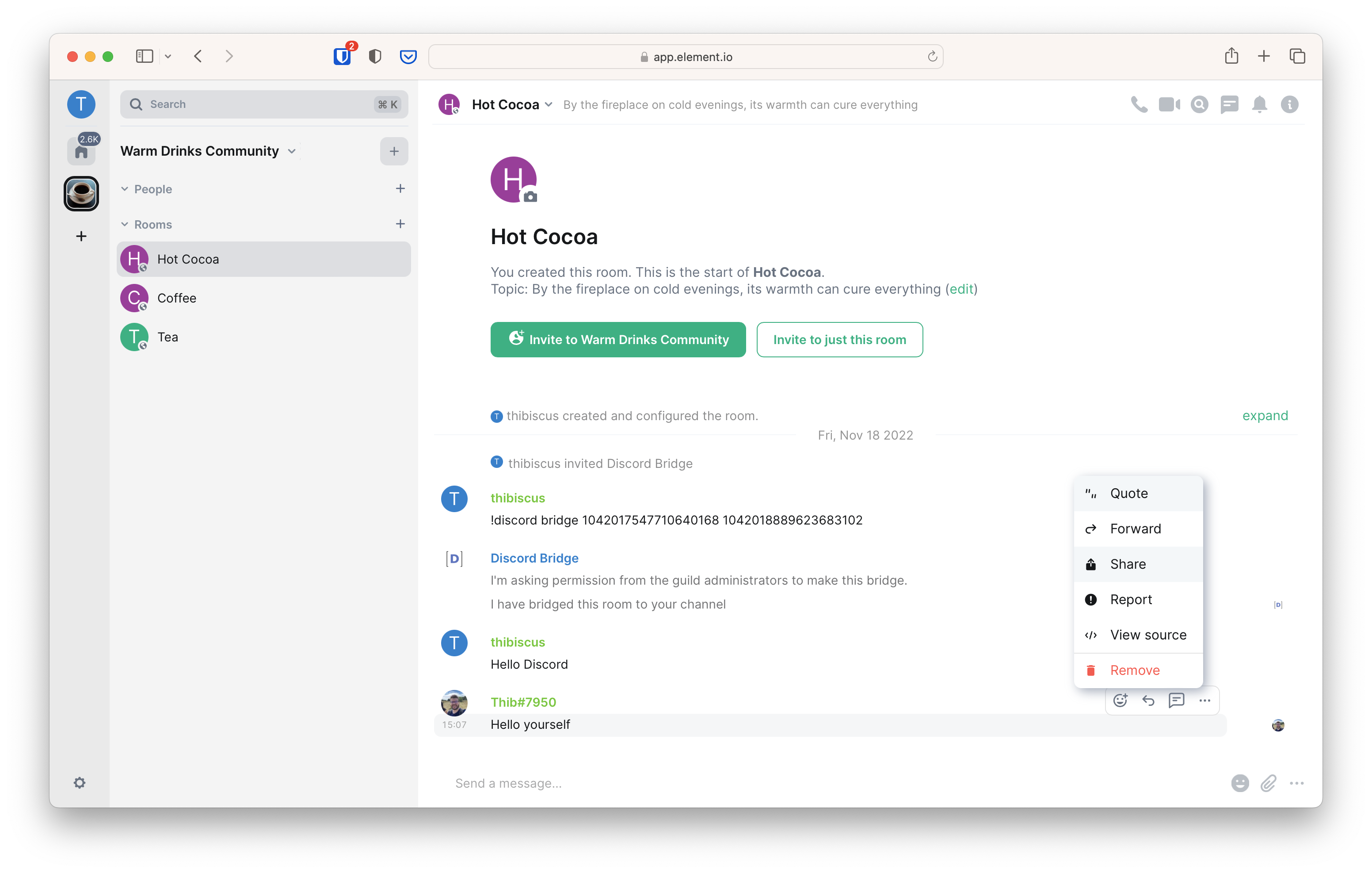 The tools built into Matrix are good for small group moderation, but they are limited for now: removing a user (temporarily or permanently) is only possible at the room level, and banning an entire server from a room is not exposed in the UI.